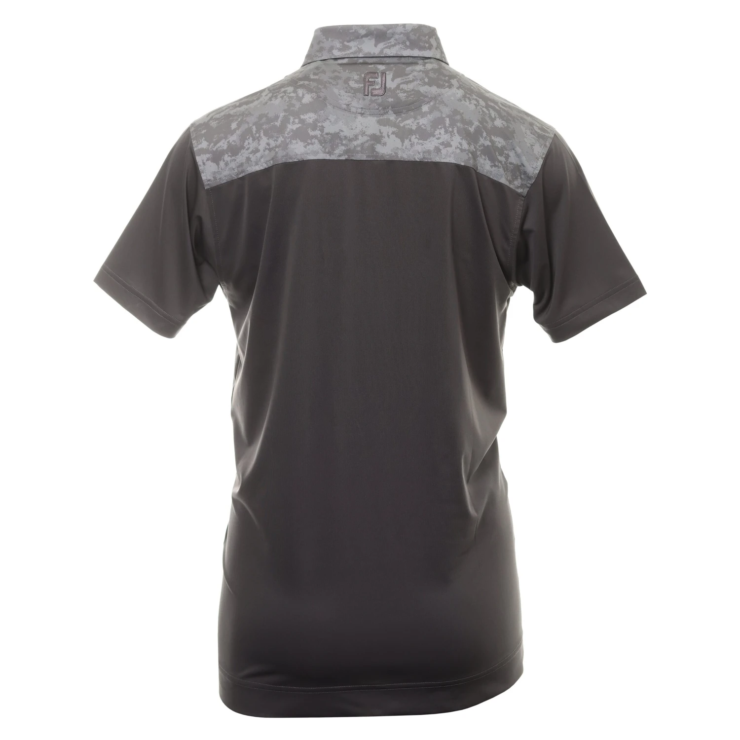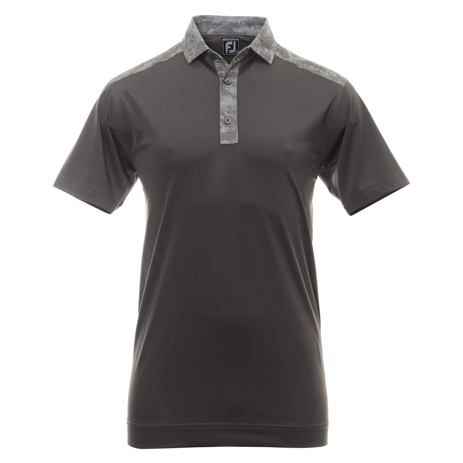 Mens FootJoy Cloud Camo Trim Golf Shirt. A stylish looking golf shirt with 3-button placket. Constructed using a technical, easy care, stretch fabric that promotes a high degree of moisture management, keeping you cool and dry on the course, whilst allowing complete ease of movement through the swing.