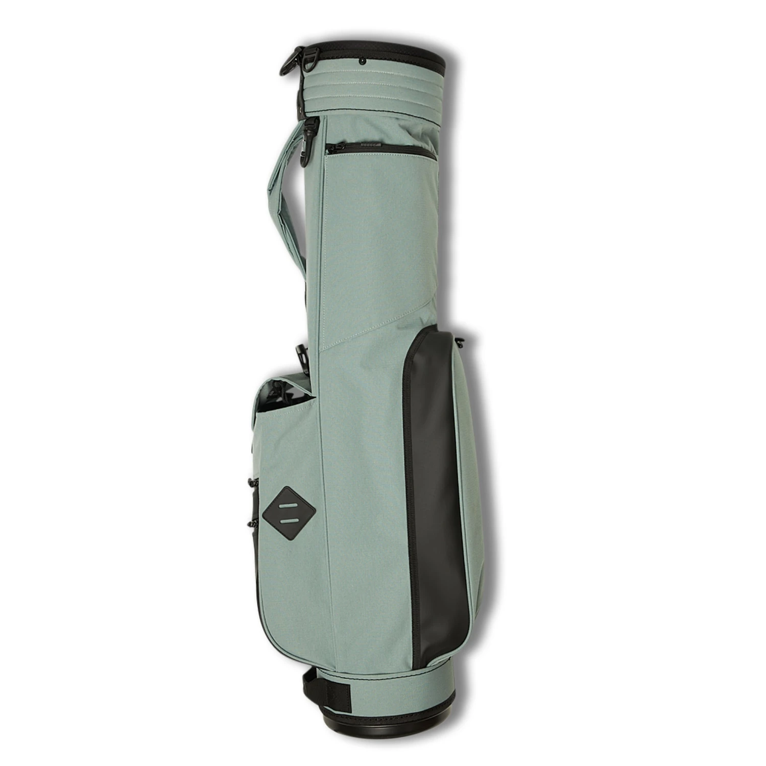 Jones Player Utility Rover R Golf Bag. The Rover is designed to combine the simplicity of the popular Players Series carry bag with the innovative aspects of the Utility Series bags. The new R-series features a recycled, ripstop material, woven from 100% PET single-use plastic bottles. Choose to carry with the iconic Jones single strap or the Utility Series double strap, the bag’s carrying options offer comfort when trekking the course. Store extra layers of clothing in the large belly pocket, keep your mid-round beverage cold in the insulated quick-draw pocket, and secure valuables in the expandable zipper pouch. The Velcro patch allows for quick access to and air-drying of your glove. Clip your range finder case onto the heavy duty D-rings, and toss your bluetooth speaker into the mesh sleeve.