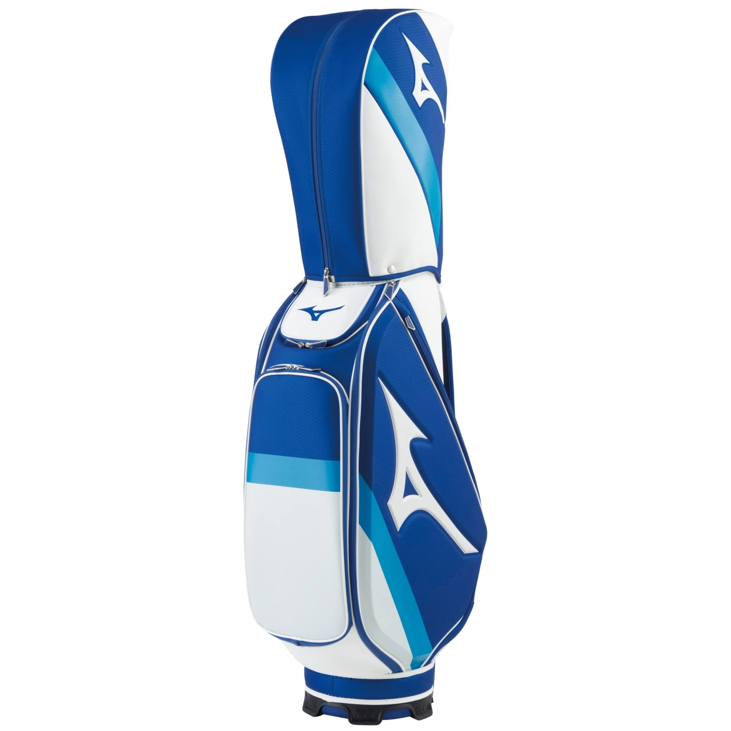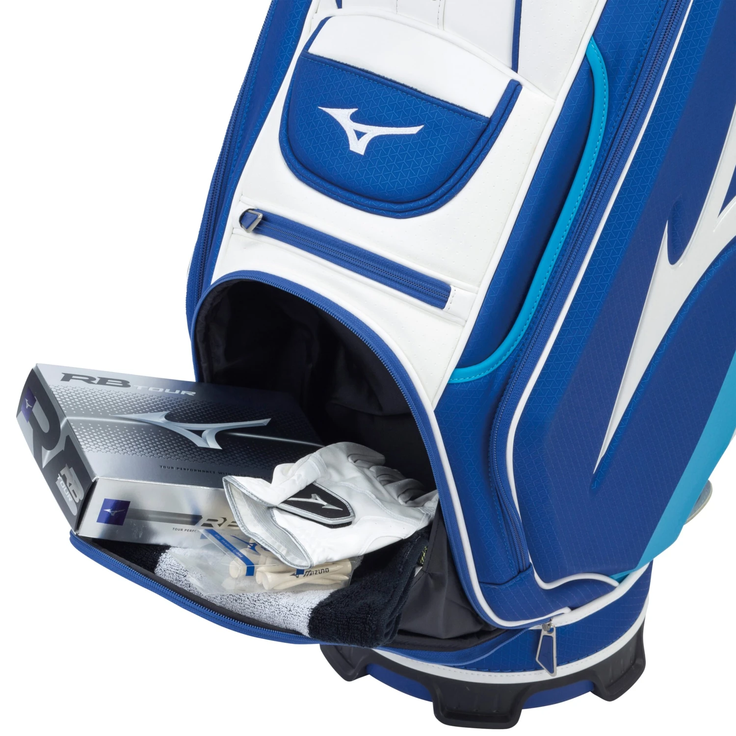 Mizuno Golf Tour Staff Mid Bag. An outstanding looking mid-sized version of Mizuno’s full tour bag which is more practical for amateur use. Not only do you get the striking visual appearance of the Tour Bag but also incredible storage. The bag incorporates the more open, flexible 5 way, 9” top cuff preferred by tour players and caddies.