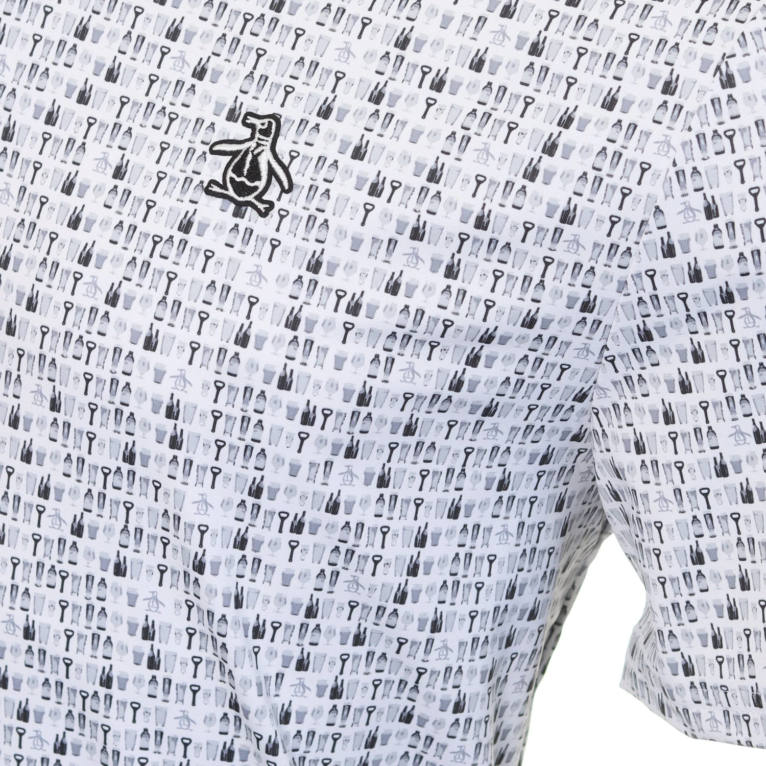 Mens Original Penguin Golf Have A Beer Print Polo Shirt. A 2-button placket polo shirt constructed from a moisture wicking fabric. OPG moisture management system, will keep you fresh and dry throughout your round. Stretch construction fabric adds comfort for a friction free swing.