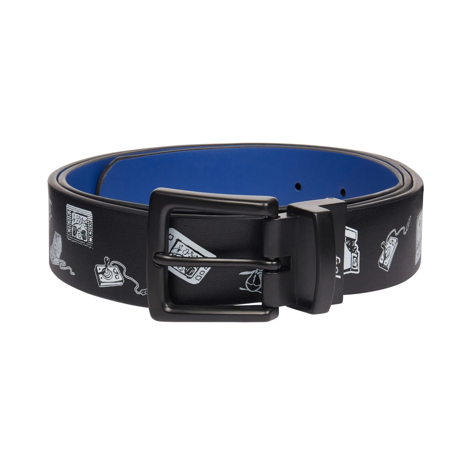 Mens Original Penguin Golf Retro Arcade Printed Belt. A sleek, reversible leather belt with a Retro Arcade print to one side and a plain bluing option to the other.