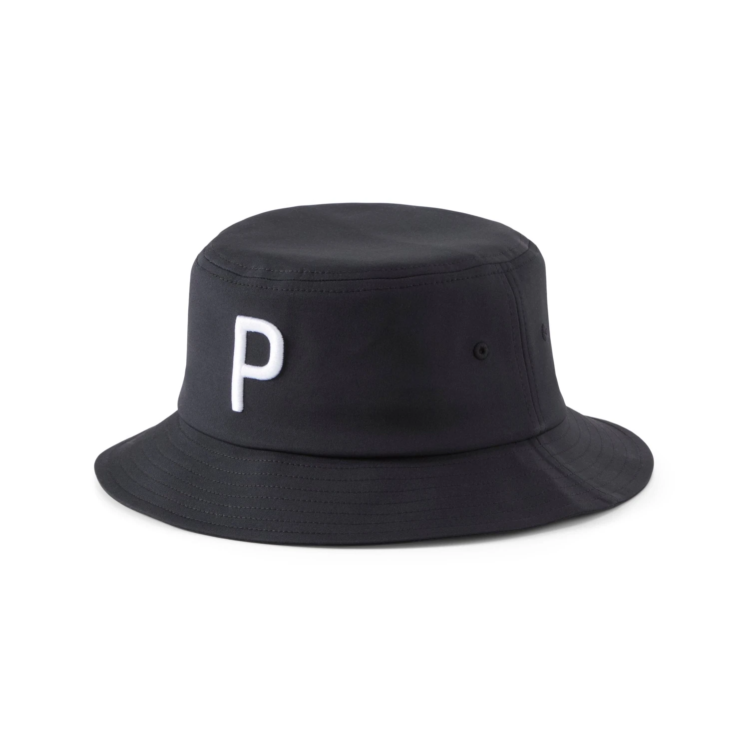 Puma Golf P Bucket Hat. A classic brimmed bucket hat that features a moisture wicking interior performance sweatband and is finished with 3D embroidered ‘P’ to the front.