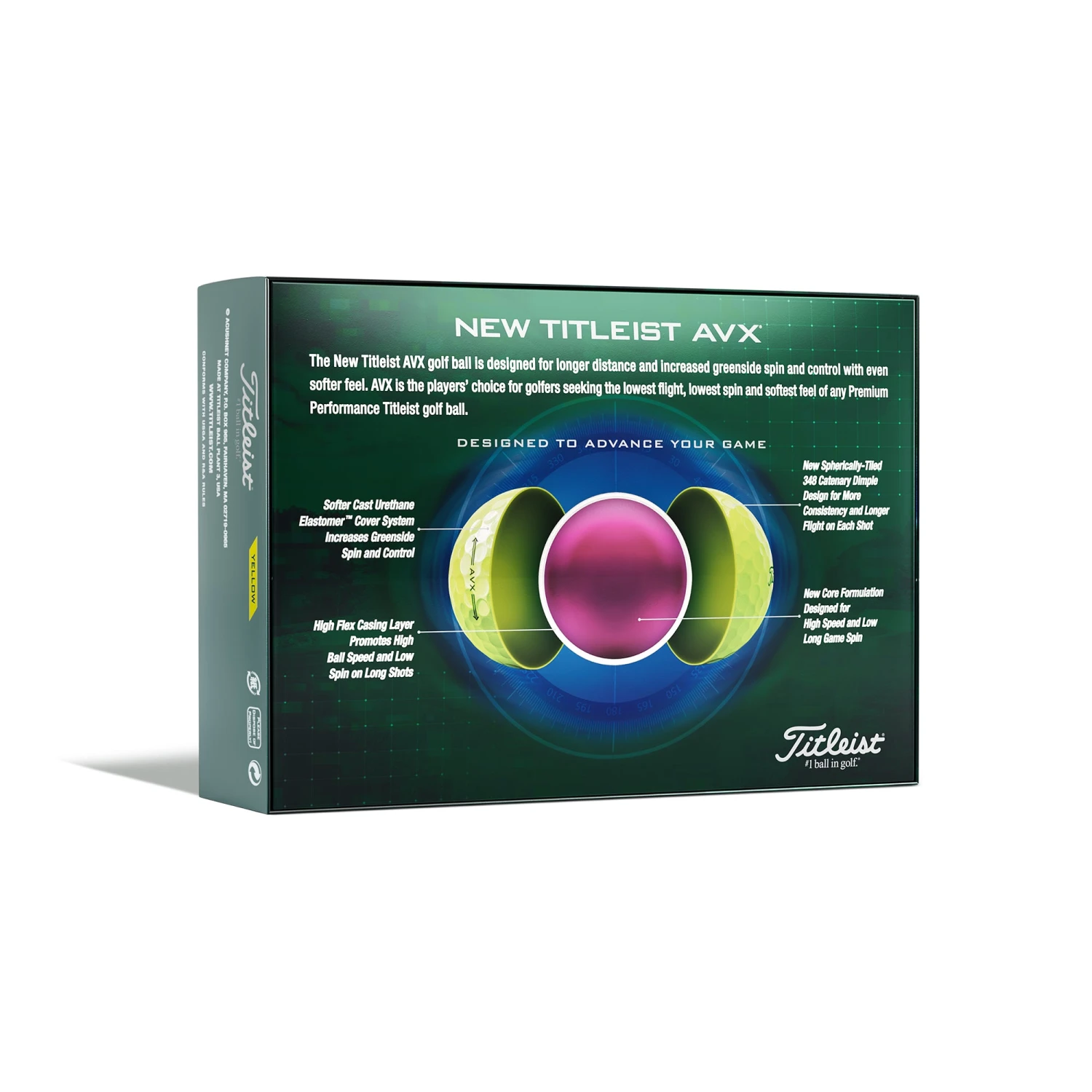 Titleist AVX Golf Balls – Yellow Dozen. The new Titleist AVX golf balls are for golfers looking to level up their game with advanced technology that delivers low flight, low iron spin for noticeably longer distance, incredibly soft feel and now, even more control.