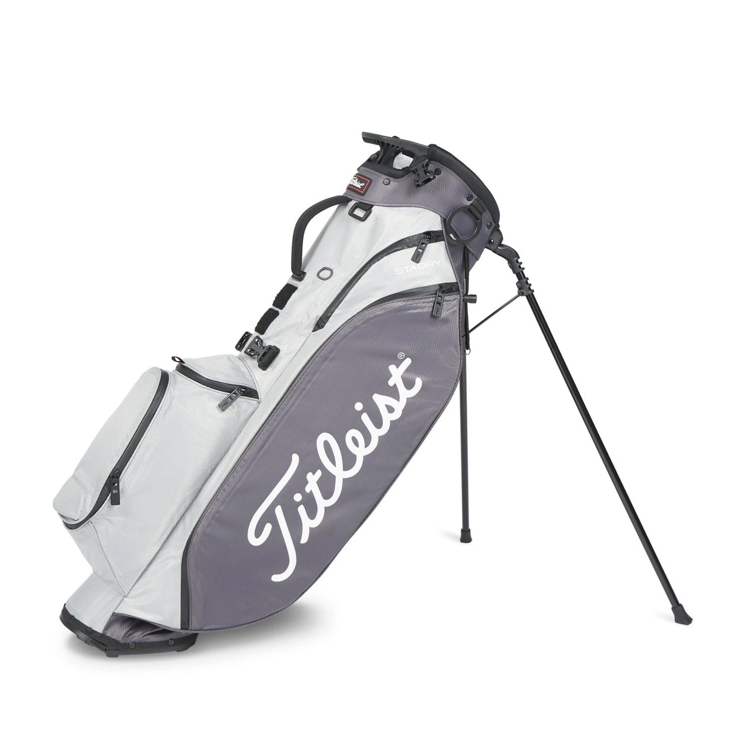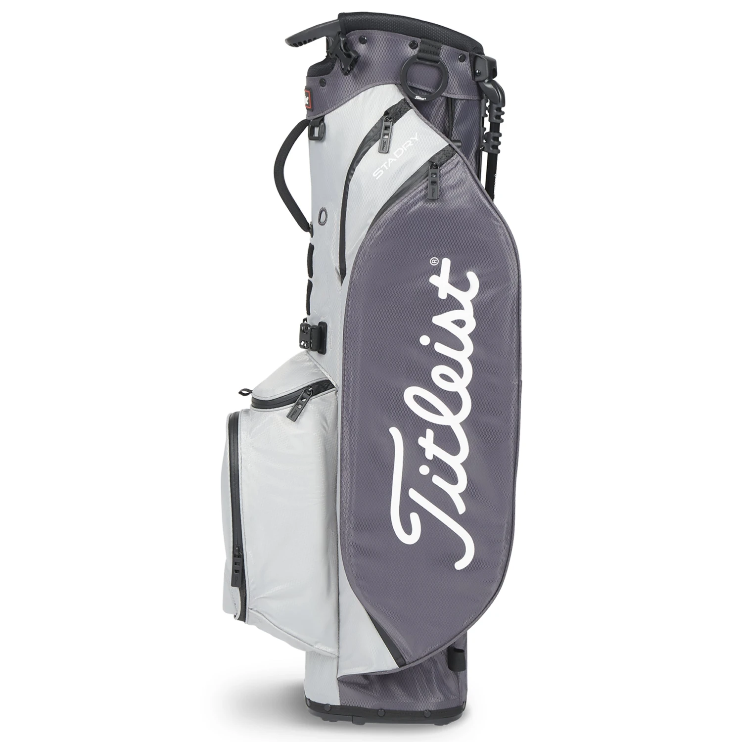 Titleist Players 4 StaDry Stand Bag. The new Titleist Players 4+ StaDry Stand Bag – A premium and functional stand bag. Features include a 4 way top with integrated handles and advanced hinged bottom for stability and durability. This bag includes a new, premium, double strap for cushioning and lasting comfort. This 6 pocket design is constructed with StaDry technology, has seam sealed zippers and includes a rain hood. Constructed in durable materials and finished with Titleist branding. Weight – 1.7 KG’s.
